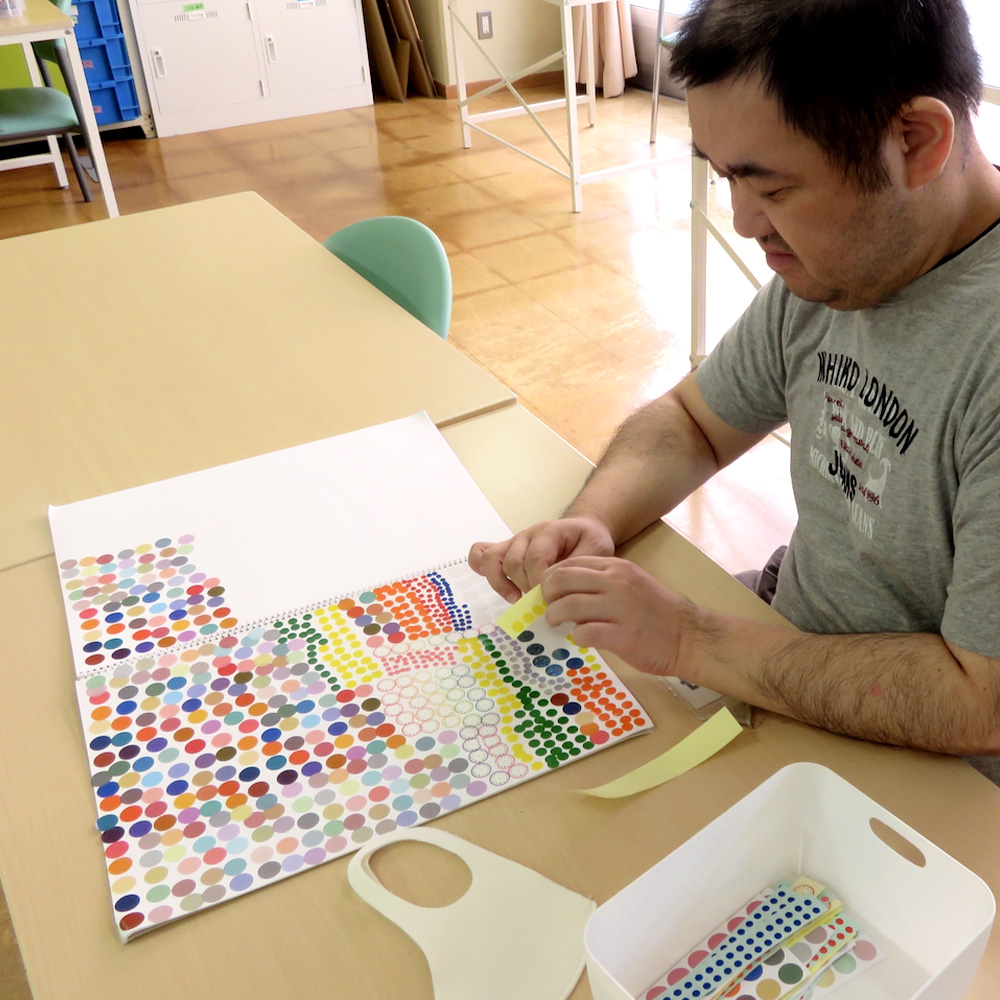 各務原市社会福祉事業団 福祉の里生活介護事業 あすなろグループに通う安江さん。普段は企業などからの受託作業をしていますが、月2回の制作活動を楽しみにされています。模造紙いっぱいに丸いシールを貼って制作していくのですが、その日の気分によって色や大きさも違うそうです😊
