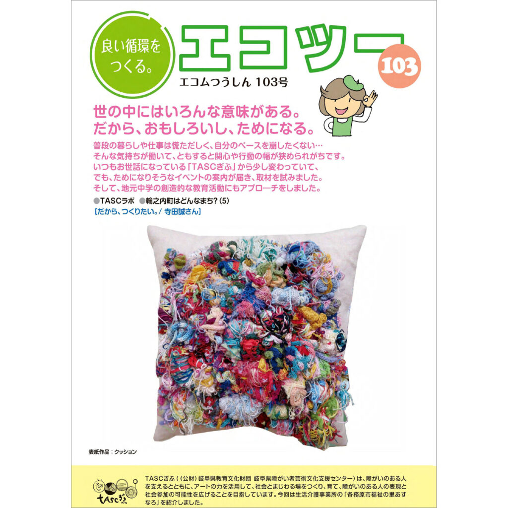 今月号の表紙を飾るのは、寺田誠さん(各務原市社会福祉事業団 福祉の里生活介護事業 あすなろグループ)の作品「クッション」。エコツー表紙初めての立体作品です😊✨実際に作品を拝見した時は思っていたより大きい印象です👀